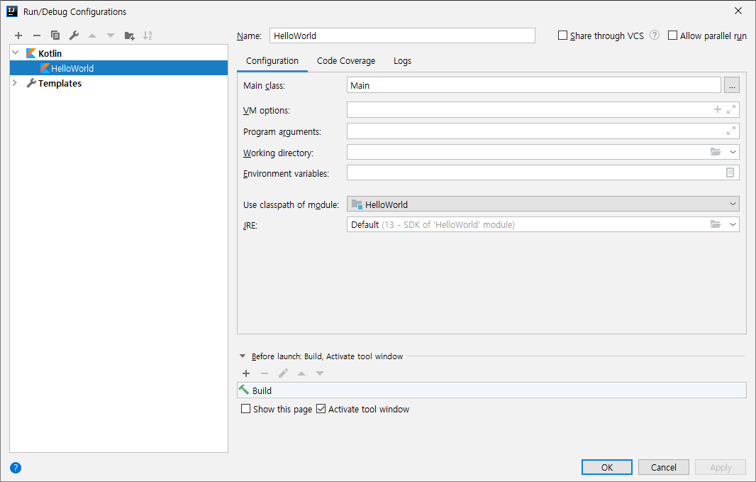 설정이 정상적으로 완료되면 아래와 같이 설정한 이름의 Configuration을 선택할 수 있습니다.