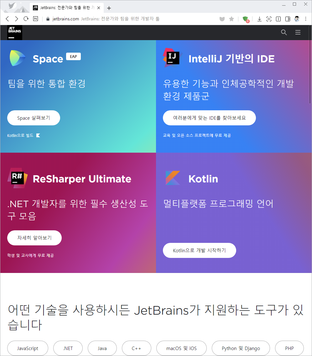 앞전의 포스팅을 통해서 설명드렸듯이, Kotlin은 JetBrains 에서 공개한 언어입니다. 코틀린이 유명해지기 전에는 IntelliJ 의 개발사로 널리 알려져 있었습니다. Android 개발을 하시는 분들이라면 IntelliJ라는 이름을 많이 들어보셨을 겁니다. 바로 Android Studio가 IntelliJ 기반으로 만들어진 IDE 이기 때문이죠. 따라서 이 강력한 툴을 통해서 코틀린 언어를 사용한 다양한 Application을 제작할 수 있습니다.