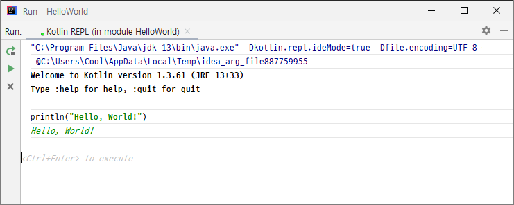 메뉴 탭의 Tools > Kotlin > Kotlin REPL 을 선택하면 아래와 같이 REPL: Read-Eval_Print Loop 창이 나타납니다. 해당 창에 println("Hello, World!") 를 입력하고 Ctrl + Enter 를 입력하면 코드가 실행됩니다.