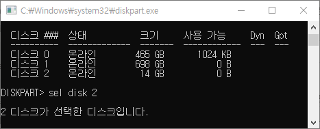 1. sel disk [USB Disk 할당 번호] // 디스크 선택