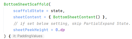또한, 반만 열림상태를 건너뛰고 싶은 경우 sheetPeekHeight 값을 0.dp 로 설정해주시면 됩니다.