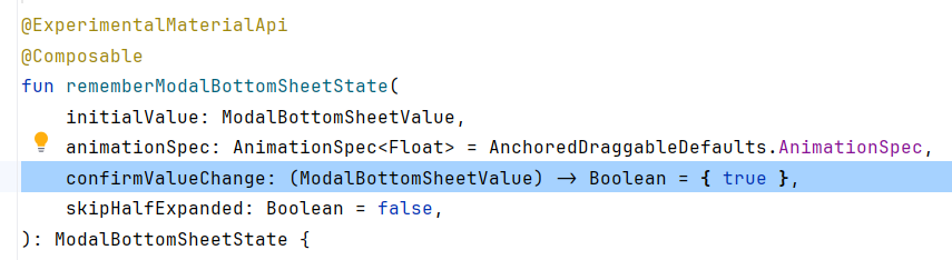 가장 간단한 형태로, 바텀시트가 노출되어야 하는 시점에 이 Composable이 노출되게 하면 됩니다.